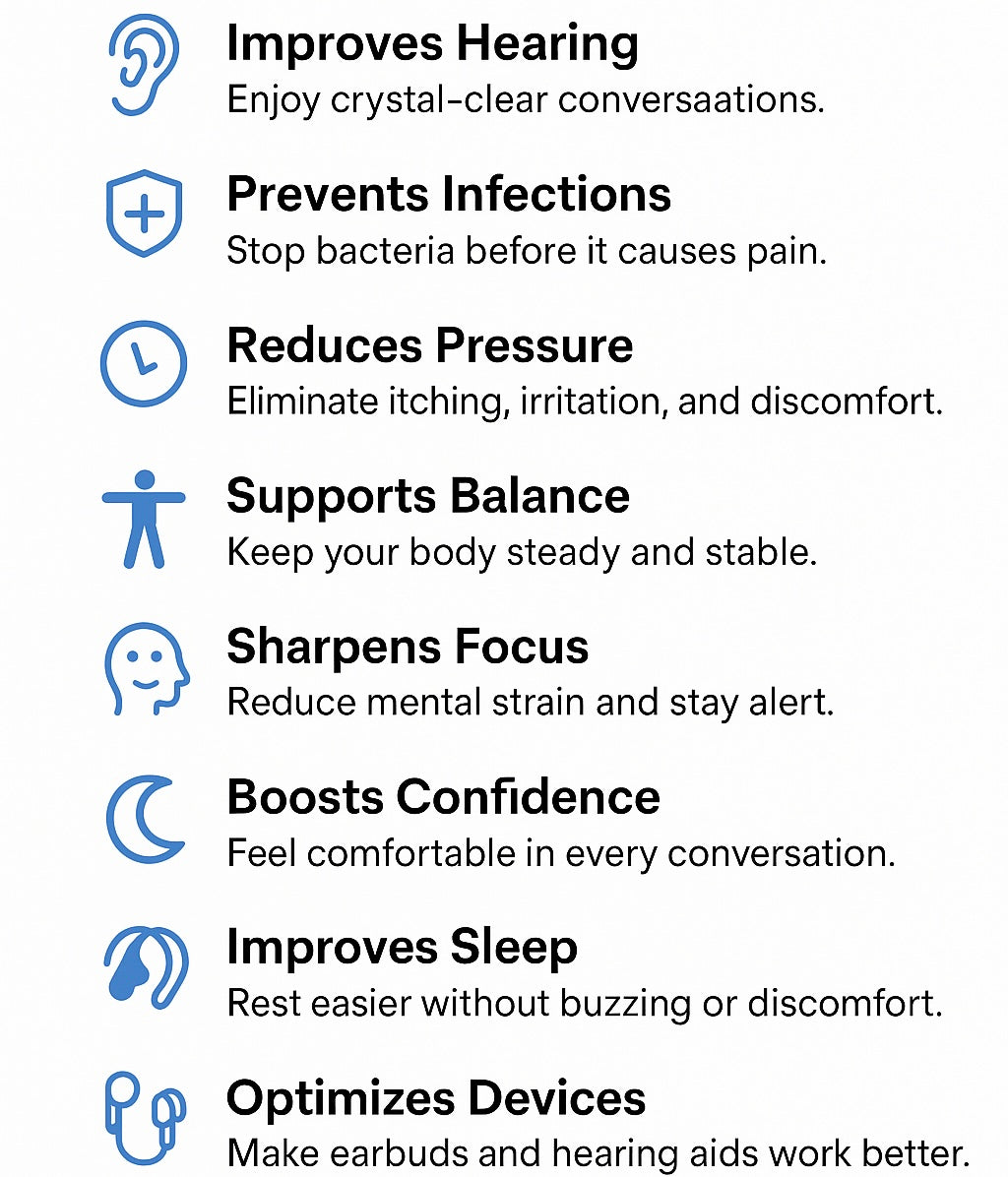 Gentle water irrigation is one of the safest and most effective ways to clear blockages, protect hearing, and keep your ears healthy — benefits include: