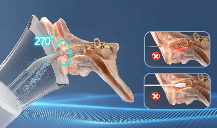 HyrdoFlush uses a three-nozzle 270° surround spray technology to provide wider water coverage, ensuring deep earwax in the ear canal is thoroughly cleaned.